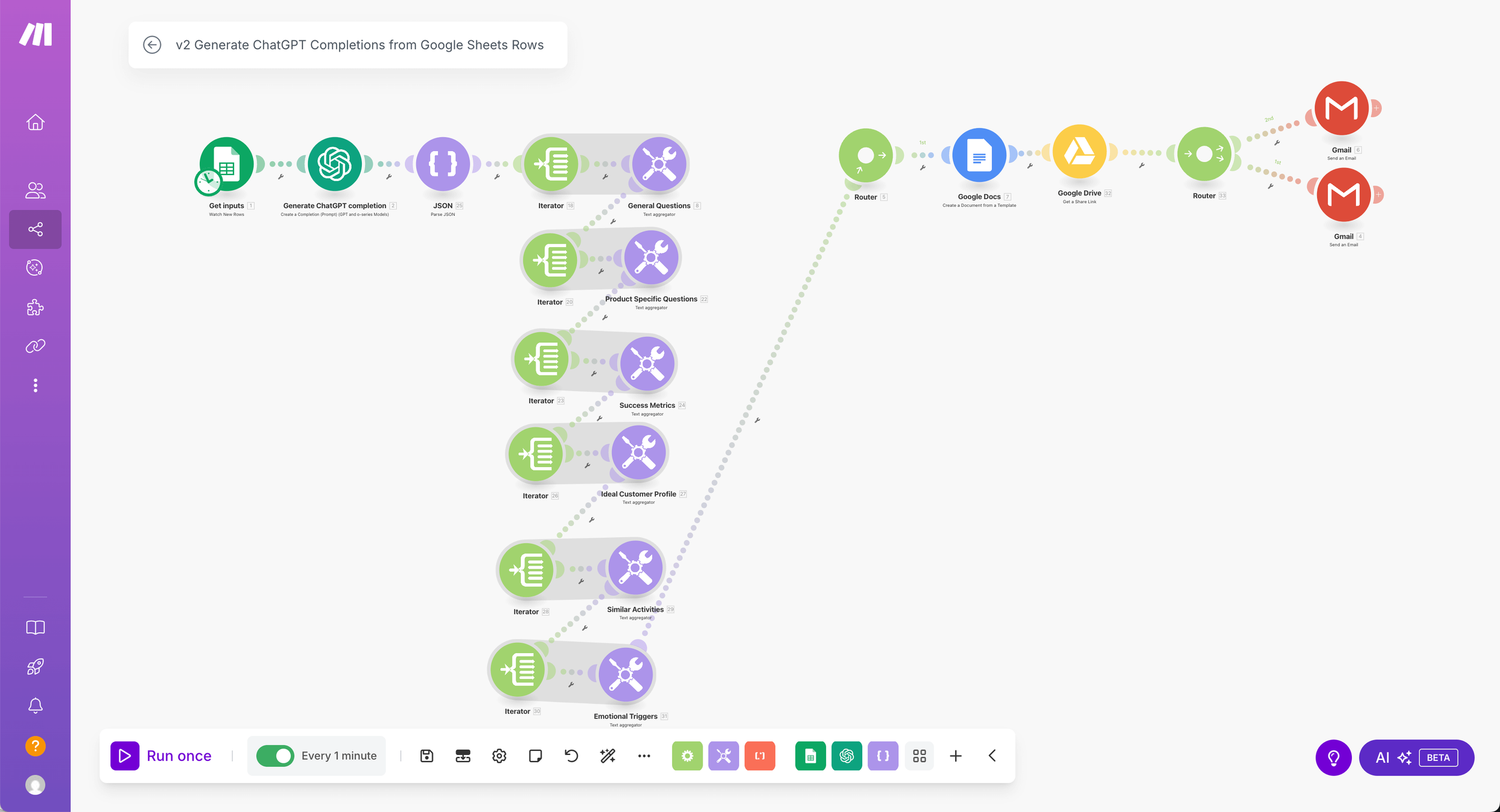 First, I had to figure out how to get chatGPT to return the same JSON keys each time (use a system prompt with a JSON “template”). Then I had to get the right combo and setup of Make.com modules to parse JSON lists into newline separated items which then turned into bullet points when finally inserted into the Google Doc.